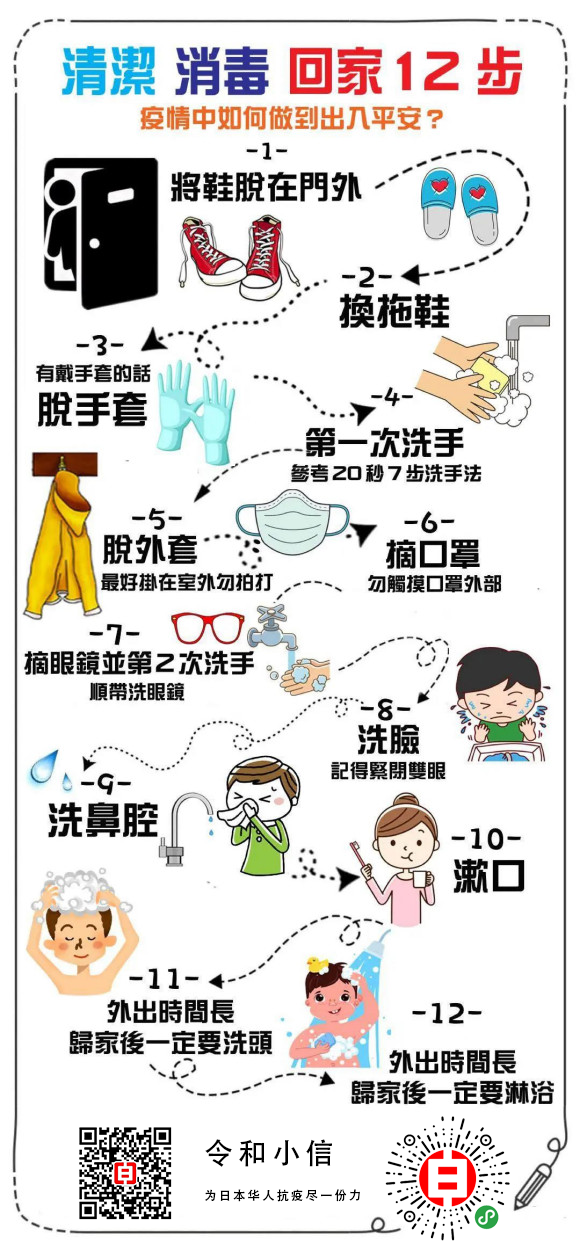 我们每天看着媒体、朋友圈各种新闻消息,对疫情无比关心,但也许很多人的防疫工作做的还是不到位。最近网上流传一个叫“回家12步“的step by step ,教大家在疫情期间每天回到家时应该怎样清洁和消毒,下面特别以插画方式深入浅出列出这12 个步骤,让大家对照参考。